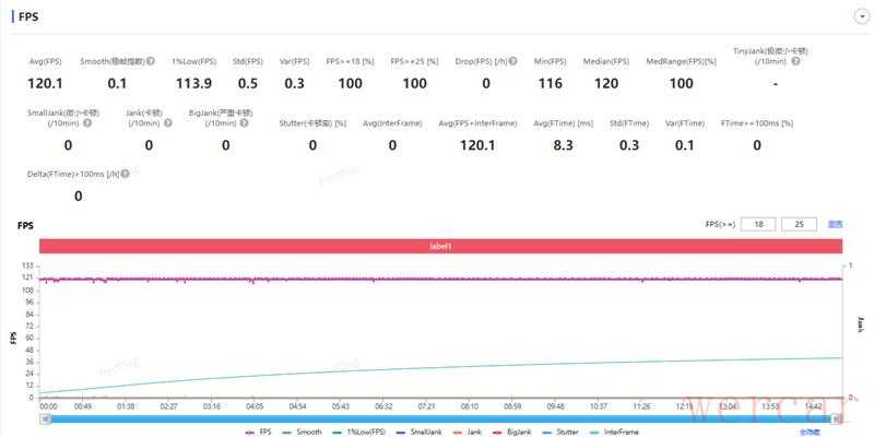 极致画质120帧的5v5回放中,平均帧数达到120.1帧,稳帧指数0.1,1%low帧113.9FPS。