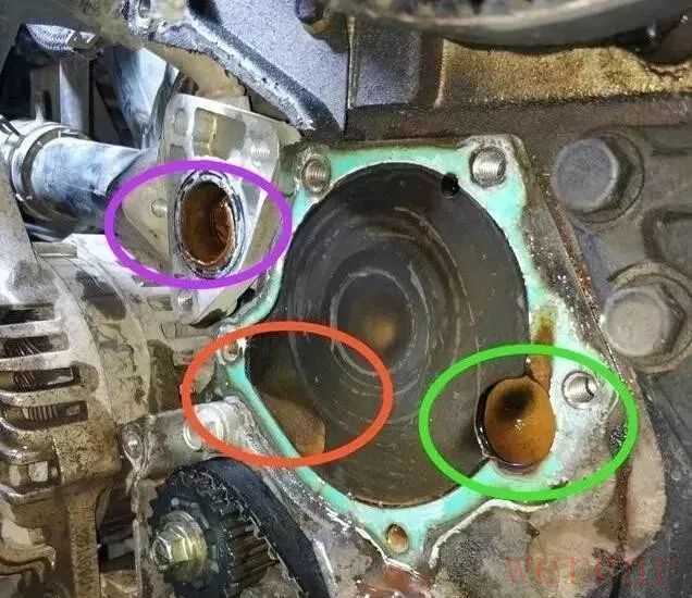 我们来看看水泵的安装位置,如下图所示,绿色区域和红色区域的孔都是在发动机上,主要是冷却液进行小循环的通道,而紫色区域所示的孔连接的是节温器,节温器打开后,冷却液就进行大循环。