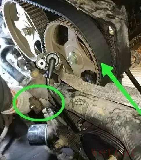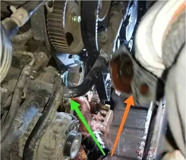 师傅检查时还发现了一个细节,散热风扇转动后,膨胀水壶上的回水管基本没有反应,并且水泵也有轻微渗水的情况。师傅给出的维修建议是:先拆下水泵检查。由于没有更好的解决办法,车主同意拆下水泵。下图绿色区域所示,这就是水泵,外部的水泵轮已经被拆下,箭头所示的正时皮带也需要拆下。