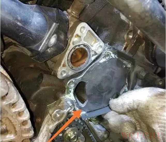 纸材质的密封垫在粘牢固后特别难清理,师傅用小刀才能把水泵安装位置的这些垫子给清理掉一部分,如下图箭头所示的情况。
