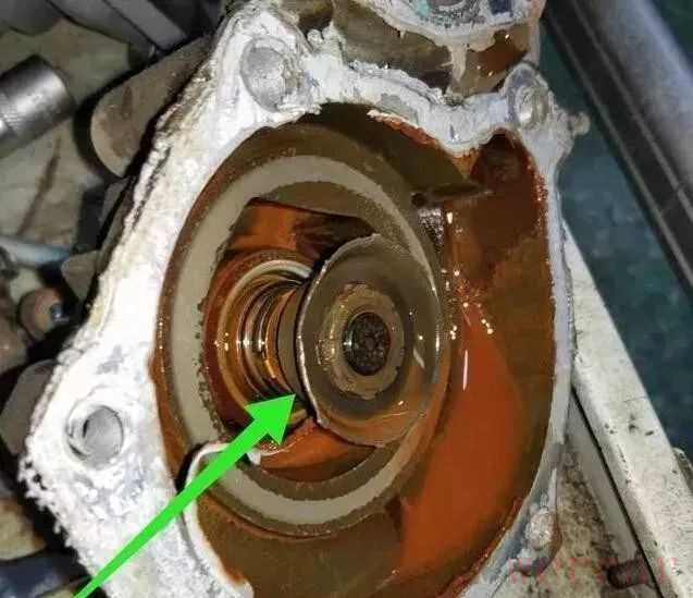 当师傅看到水泵内部的情况时,很是惊讶,如下图绿色箭头所示,它的叶轮已经找不到了!水泵主要就是依靠内部的叶轮来让冷却液循环,现在没了叶轮,冷却液肯定就不会循环!车主在看到水泵这样的情况后,甚至怀疑是师傅把叶轮给拆下的,直到看到小编拍的照片才相信水泵叶轮早就掉了!