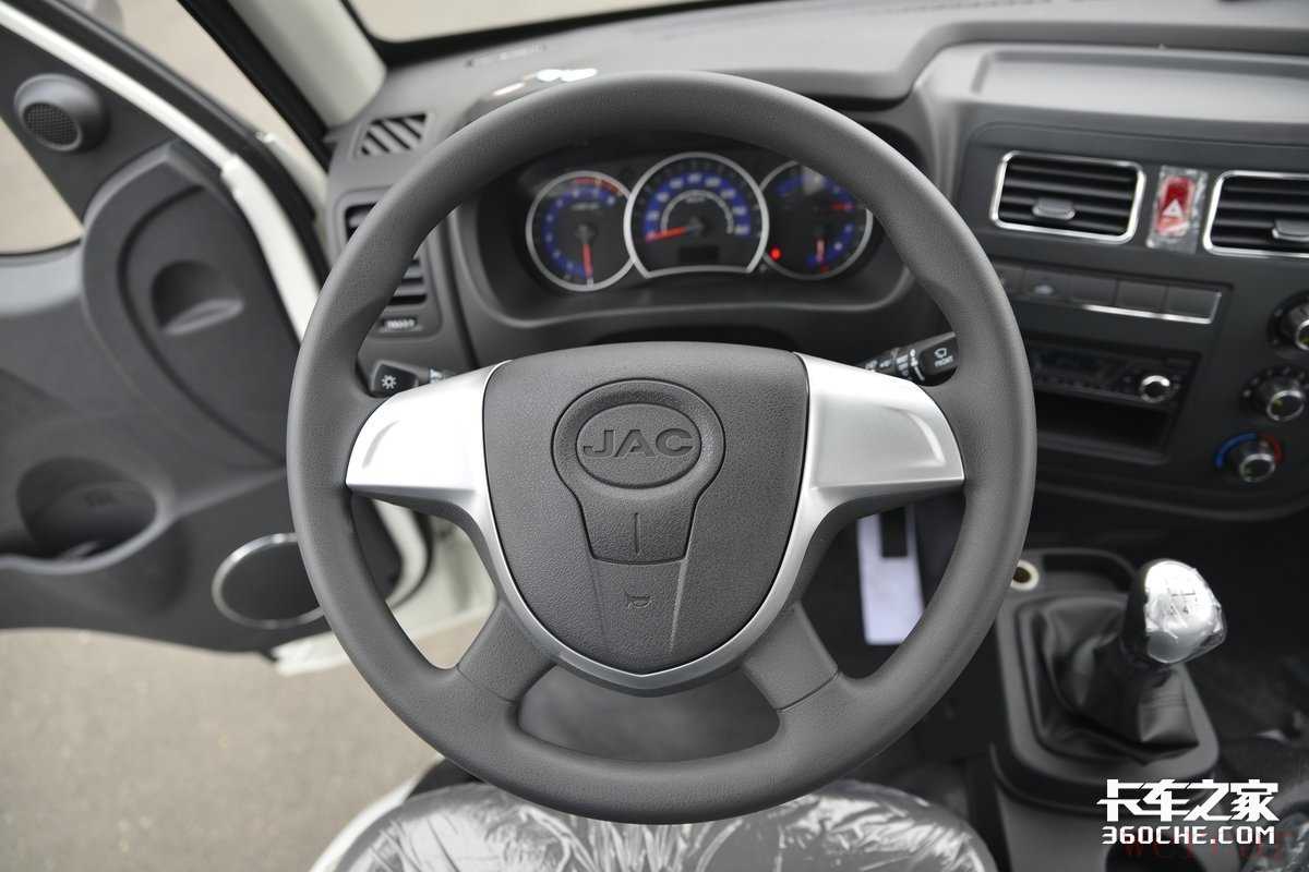 方向盘采用四幅式设计,熟悉的盾牌风格造型,黑色和银色饰板的搭配,在很多江淮车型上都出现过。喇叭两侧面板预留了多功能按键的位置,预算充足的卡友可以选择升级多功能方向盘,能给驾驶体验带来不小的提升。