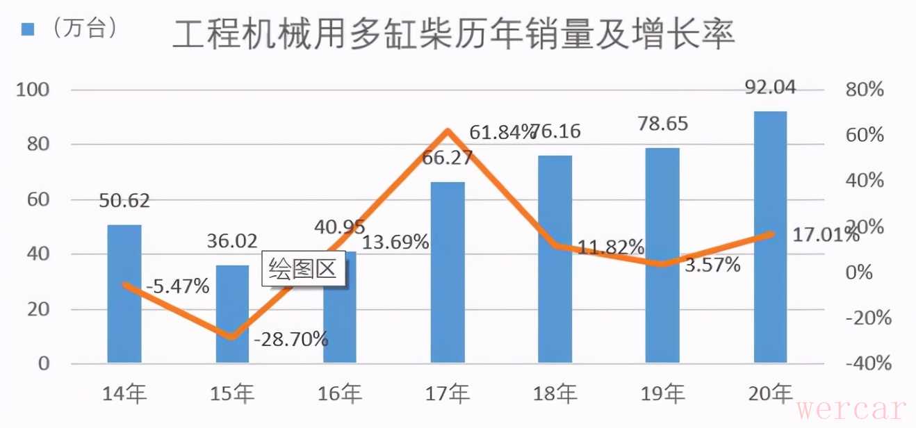 毋庸置疑的是,在《中国制造2025》的指导下,工程机械行业将不断加快转型升级进程,改变传统粗放增长方式,对高性能柴油发动机产品产生更高的需求。工程机械中单缸柴油机配套较少,主要配套多缸柴油机在2014年-2020年呈现上涨趋势,截至2020年中国内燃机工业年鉴统计数据,工程机械用多缸柴油机销量实现92.04万台,增长率为17.01%。