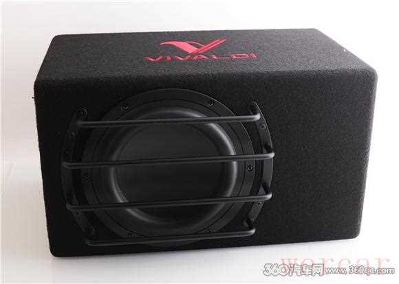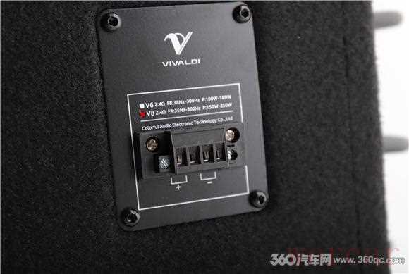 V8的箱体是梯形结构开孔式木箱体,由黑色绒布包裹,红色的维尔帝VIVALDI英文LOGO绣在箱体的上方。箱体的结构是由卡莱工程师通过校声实验最后定制而成,能够让箱体内的超低音喇叭发挥出最佳的音效。应用的8寸超低音喇叭,采用加强PP音盆有极好的刚性,在超大R高弹橡胶悬边的配合下,呈现出的低频不会过于强硬或是沉闷,而是有更好的弹性和细腻度。喇叭前方是四根高硬度防护钢杆,保护喇叭不会受伤害。