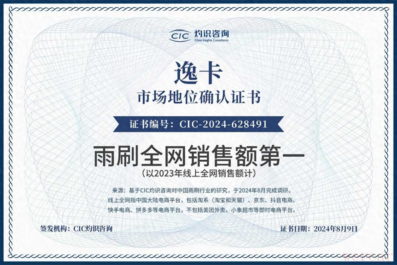 2024年8月9日,逸卡获得由知名权威咨询机构CIC灼识咨询授予的“雨刷全网销售额第一”市场地位确认书!