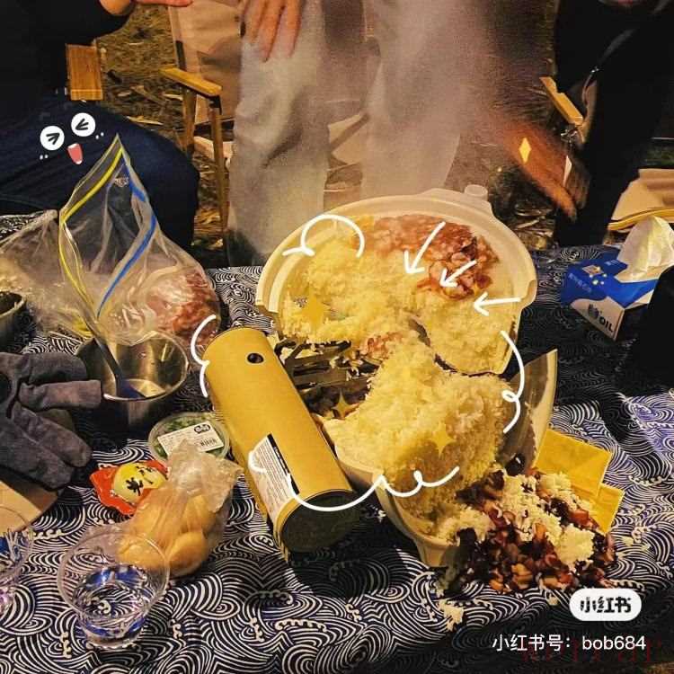 新买的锅,刚学会的煲仔饭。锅炸了不要紧,捞起来继续吃。/小红书@五亿爱露营