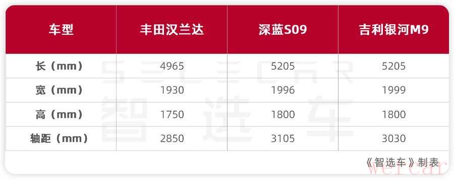 单从级别来看,这3款车其实不在一个池子里。汉兰达定位中型SUV,深蓝S09是大型SUV,而银河M9则是中大型SUV,但由于都处于20-30万这个价位,因此大家难免会进行对比,也有不少人问我们这3款车应该怎么选?
