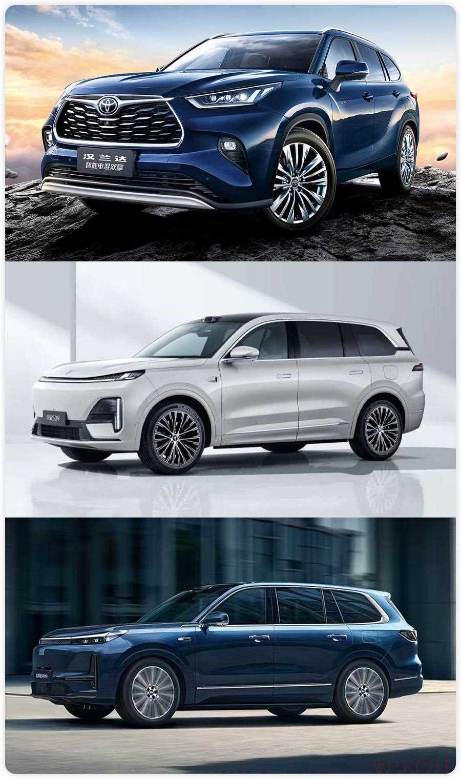 热门三排座大尺寸SUV对决,丰田汉兰达、深蓝S09与银河M9,哪款是你的首选?