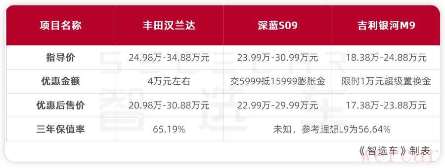 不过,买车不能光看裸车价,更要考虑保值率。汉兰达作为合资老炮,征战国内市场多年,凭借着良好的稳定性和市场口碑,三年保值率达65.19%。深蓝S09和银河M9作为刚上市的新车,虽然目前没有准确的保值率数据,但参考理想L9,它的三年保值率为56.64%。