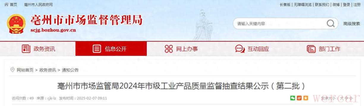 安徽省亳州市市场监管局发布2024年第二批市级工业产品质量抽查结果公示