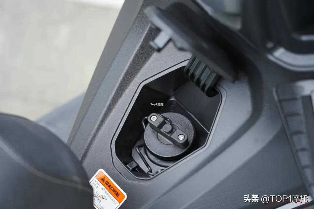 前面有两个手套箱,左边能放手机也能充电,右边是水箱加注口放个钥匙以及小物件还行。再往后面,油箱可以通过旋钮一键开启,油箱容量比较大有12.6升。