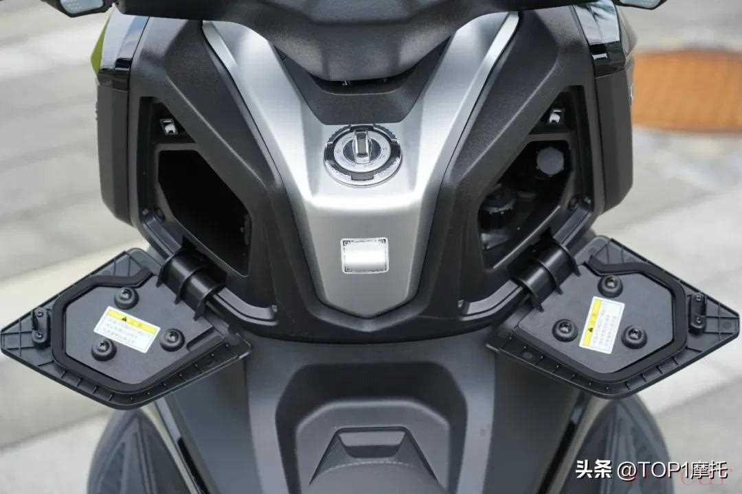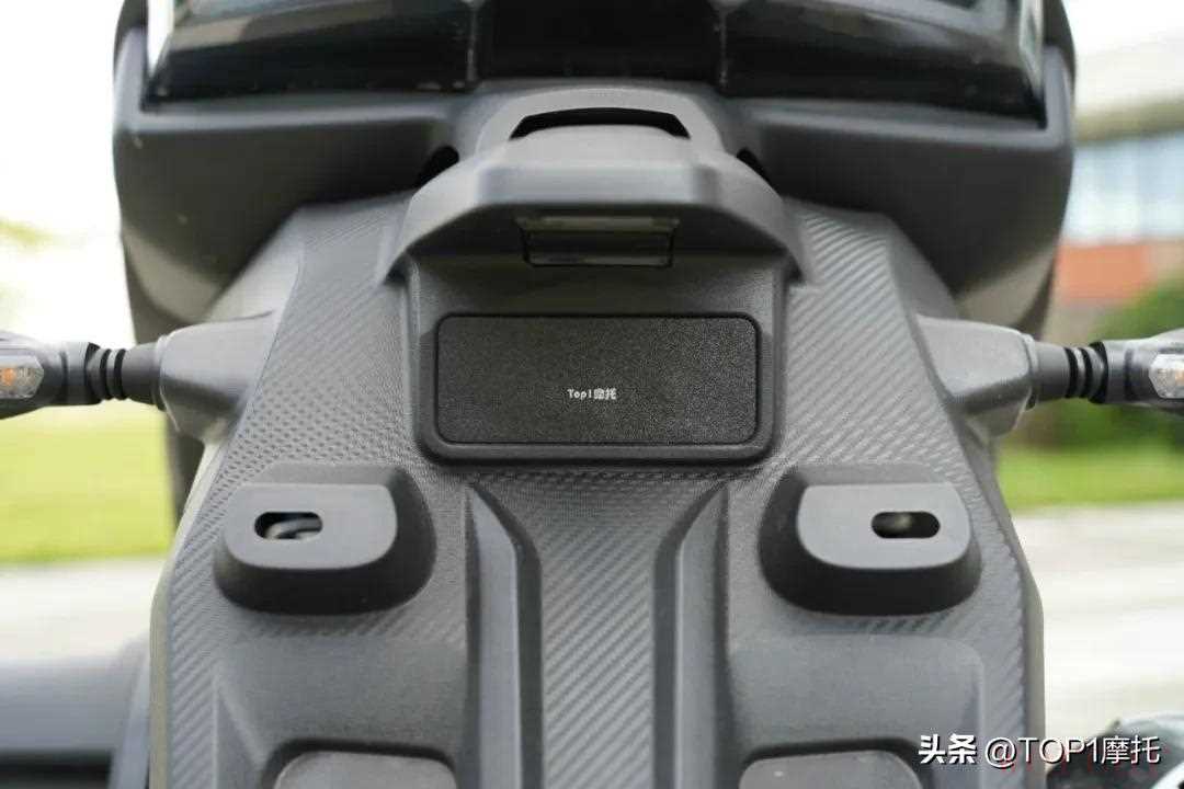 来到车尾这个不起眼的小方块,其实就是毫米波雷达模块,所以千万注意倒车的时候,别把后牌照框干碎了。也因为有雷达模块,所以这台车有全场景的盲区监测功能,在后方有车进入雷达监测范围的时候,会在仪表的左上角和右上角出现警示标识,大幅度提高骑行当中的安全性能,这个功能在踏板车型当中还是十分少见的,也是一个比较实用的高阶辅助驾驶功能。