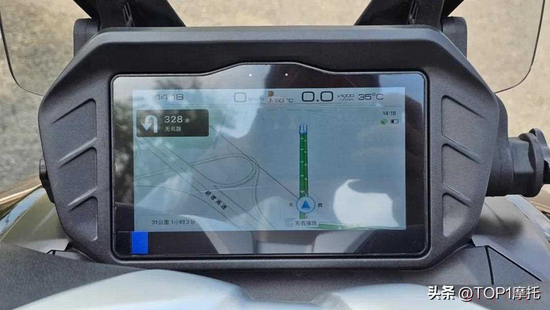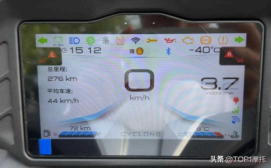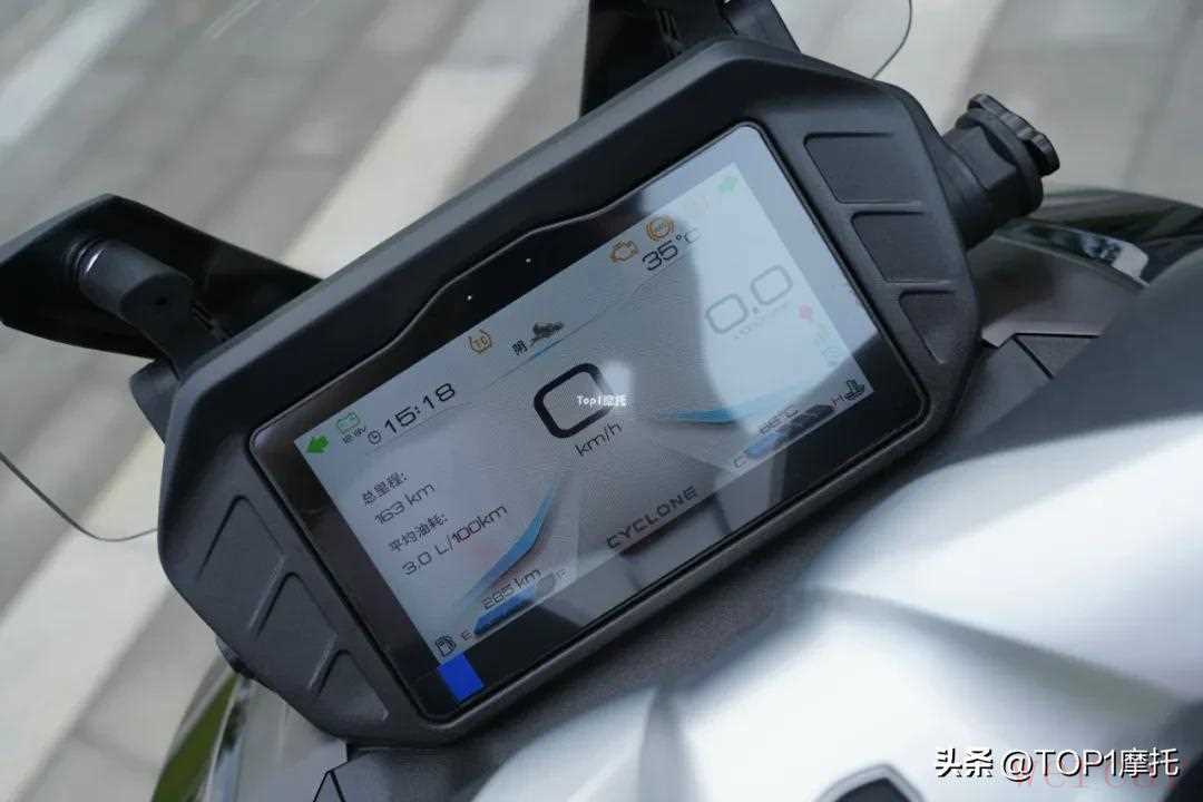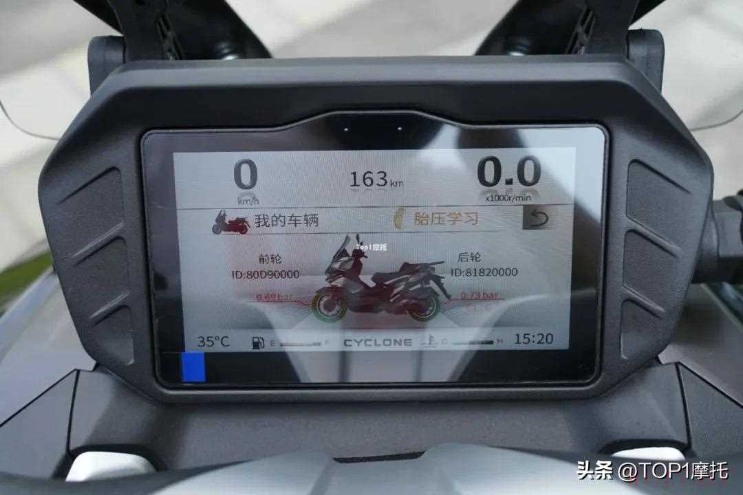 然后是这块大尺寸的TFT仪表,这个仪表的形状和尺寸在很多赛科龙车型上都用过,但是UI界面是新的设计,并且数据简单直观,我觉得挺好看的,然后他这里有最高时速记录,剩余油量上还显示续航里程很直观。包括天气、气温和胎压的数据一眼也能看到,进入车辆信息界面还有更多的功能数据提供。