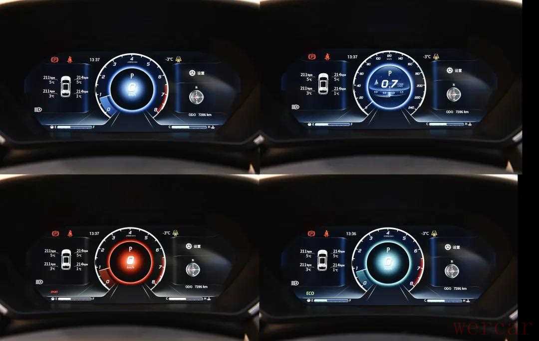 10英寸的液晶仪表为顶配车型独享,UI主题可根据当前驾驶模式(普通、运动、ECO)进行变化,其中普通模式还可以自定义显示页面样式,带有流星划过的动态效果十分抓人眼球。