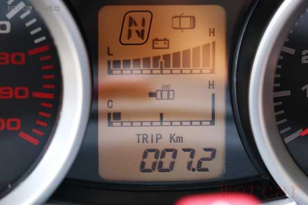 简约的仪表设计,中间的电子屏显示的是车速以及行驶里程的信息;电子屏的外圈是电量显示,以色差指示灯表示剩余电量的多少。左侧色条显示的是电机温度,右侧色条显示的是输出电流。虽然采用了简约的设计,但是信息量十足,可谓是简约而不简单。