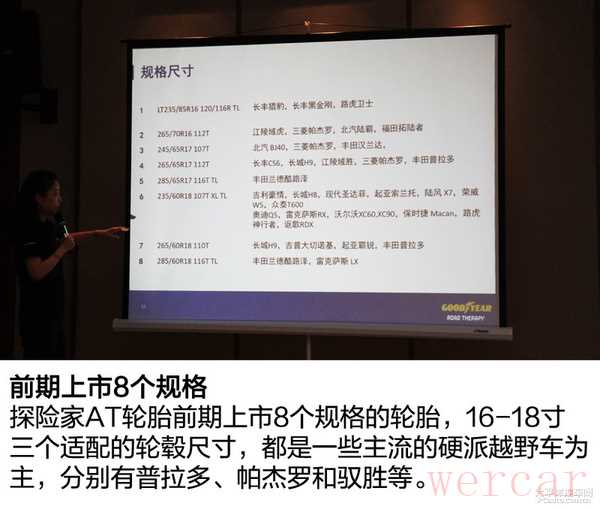 胎体采用什么结构和3T指数的值有多少等,这些消费者都是比较关注的点,探险家AT轮胎还是能让大家觉得这些满意的地方。而且它前期推出的8个不同规格,涉及的硬派越野车型和城市SUV车型还是蛮广的;后期还会陆续推出其他规格。