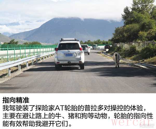 到达林芝修整后,我们第二天去雅鲁藏布江大峡谷景区,在回来的路全程是我驾驶,行驶的路面主要是村道和高速路,泥泞和坑洼路面和我无缘。轮胎的操控主要体现在避让村道上的牛、猪和狗,变向精准性较好,不拖沓,提速也够快。