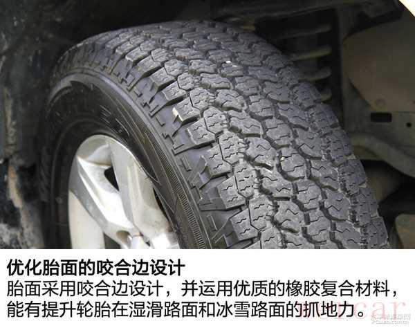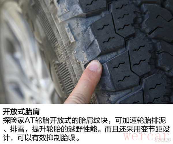 另外,探险家AT轮胎开放式的胎肩纹块设计,可快速排出沟槽中的泥土和冰雪,提高轮胎的抓地性能。而编辑还注意到,这种开放式的胎肩还采用变节距设计,对降低轮胎噪音能达到一定效果。