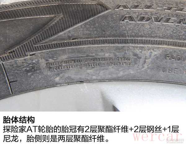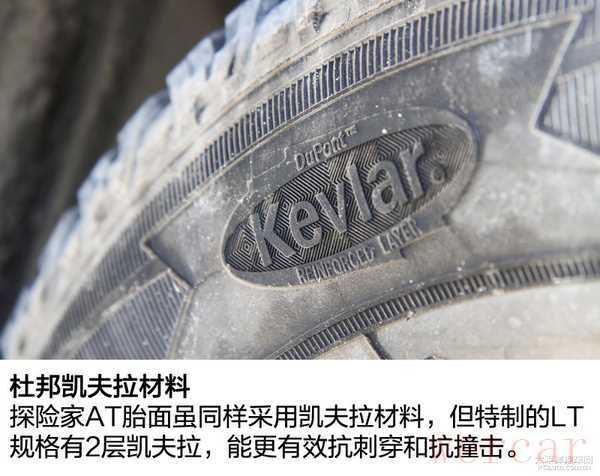 探险家AT轮胎虽同样采用凯夫拉材料,但它在带束层增加了30%的钢丝,而且采用防撞墙技术;LT规格还采用了2层凯夫拉材料。看到这些会不会觉得已经很结实耐撞了?结果是肯定的。凯夫拉材料可以有效防止轮胎被刺穿,2层更不用说;而增加30%的钢丝,还采用防撞墙技术,轮胎的抗扎、抗划性能比现款的更出色,轮胎也更耐用。