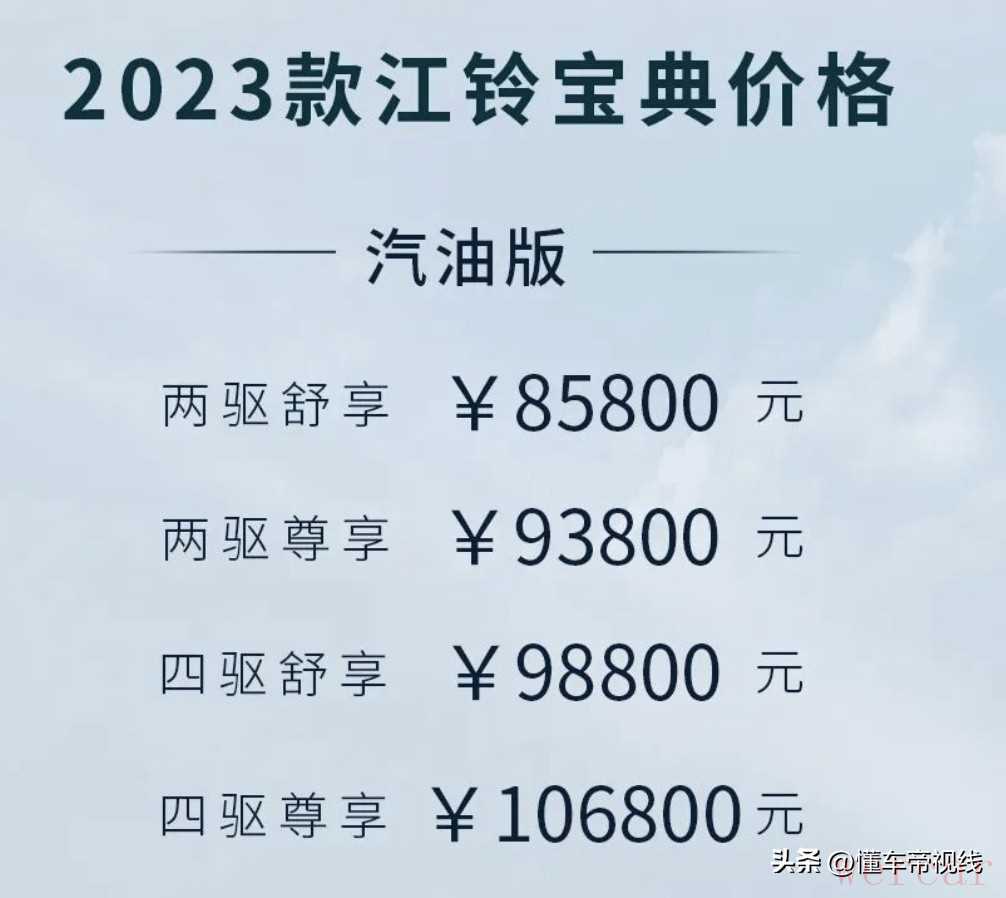 简单来说,江铃新款宝典提价后上市,以8.58万的起售价加入与小型SUV市场领导者之一长城风骏7的直接竞争行列。
