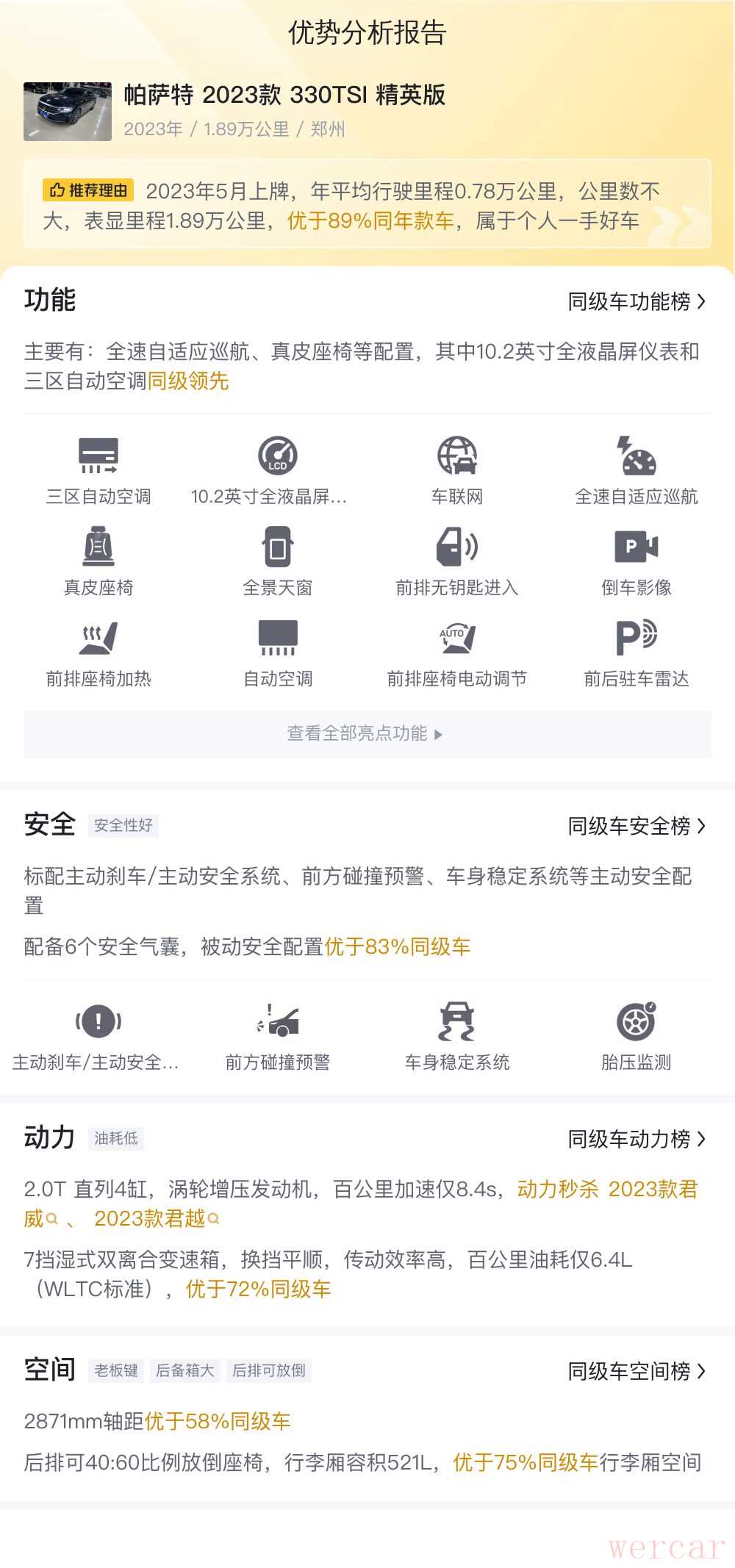 先来看看这辆二手帕萨特的基础信息,该车的具体版本是2023款 330TSI 精英版,上牌地为郑州,上牌日期2023年5月,表显里程1.89万公里,车身颜色为黑色,新车指导价20.59万,二手车报价13.58万,未过户。
