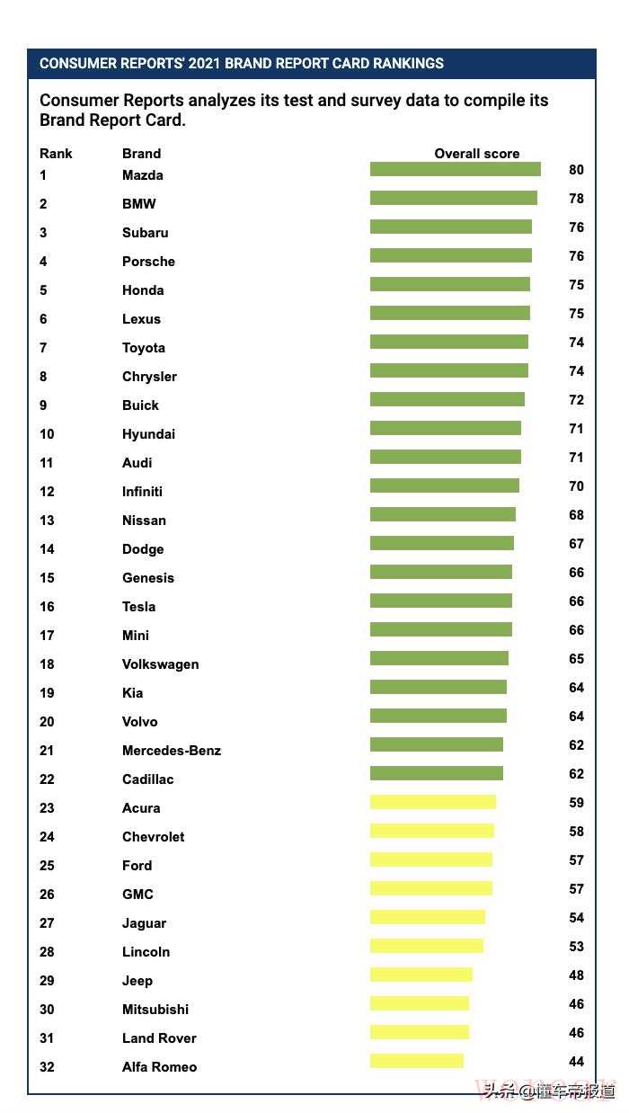 日前,美国权威杂志《消费者报告》(Cosumer Reports)评选出了2021年度最可靠汽车品牌排名。马自达、宝马、斯巴鲁位列前三名。