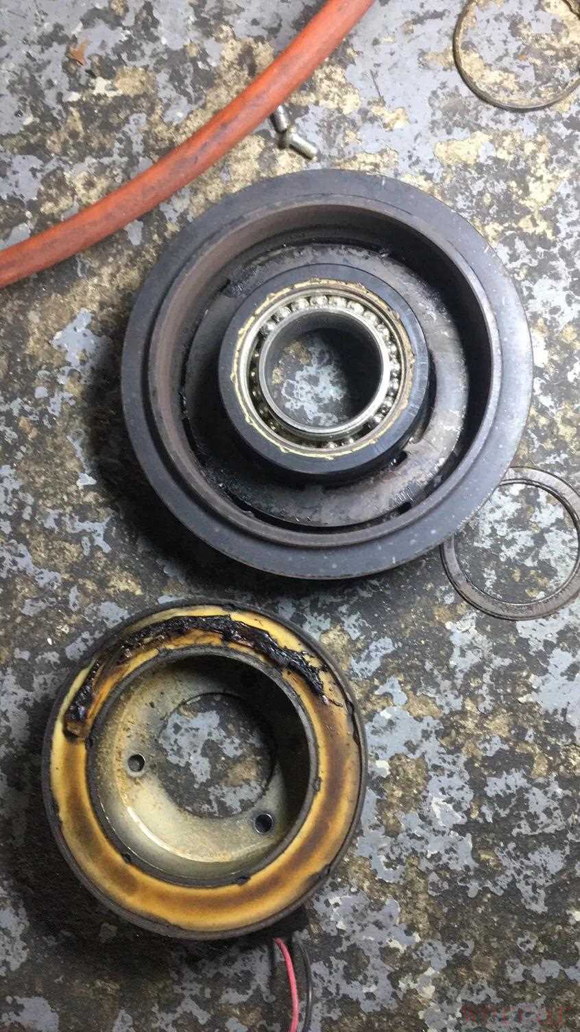取皮带盘的时候也要小心一点,可以用锤子敲击皮带盘的后面边缘,同时用翘棒翘住另一边对称的位置,保证两边受力均匀,经过连续敲击,皮带盘慢慢就出来了;最后就看到烧焦的电磁线圈了,三个固定螺丝拆下来就可以更换了,安装简单一点,卡簧和垫片装好一般就不会有问题了,这个是空调突然不冷的情况下一般就是这个线圈换了,如果慢慢不冷的话估计就是空调系统存在漏制冷剂的地方。