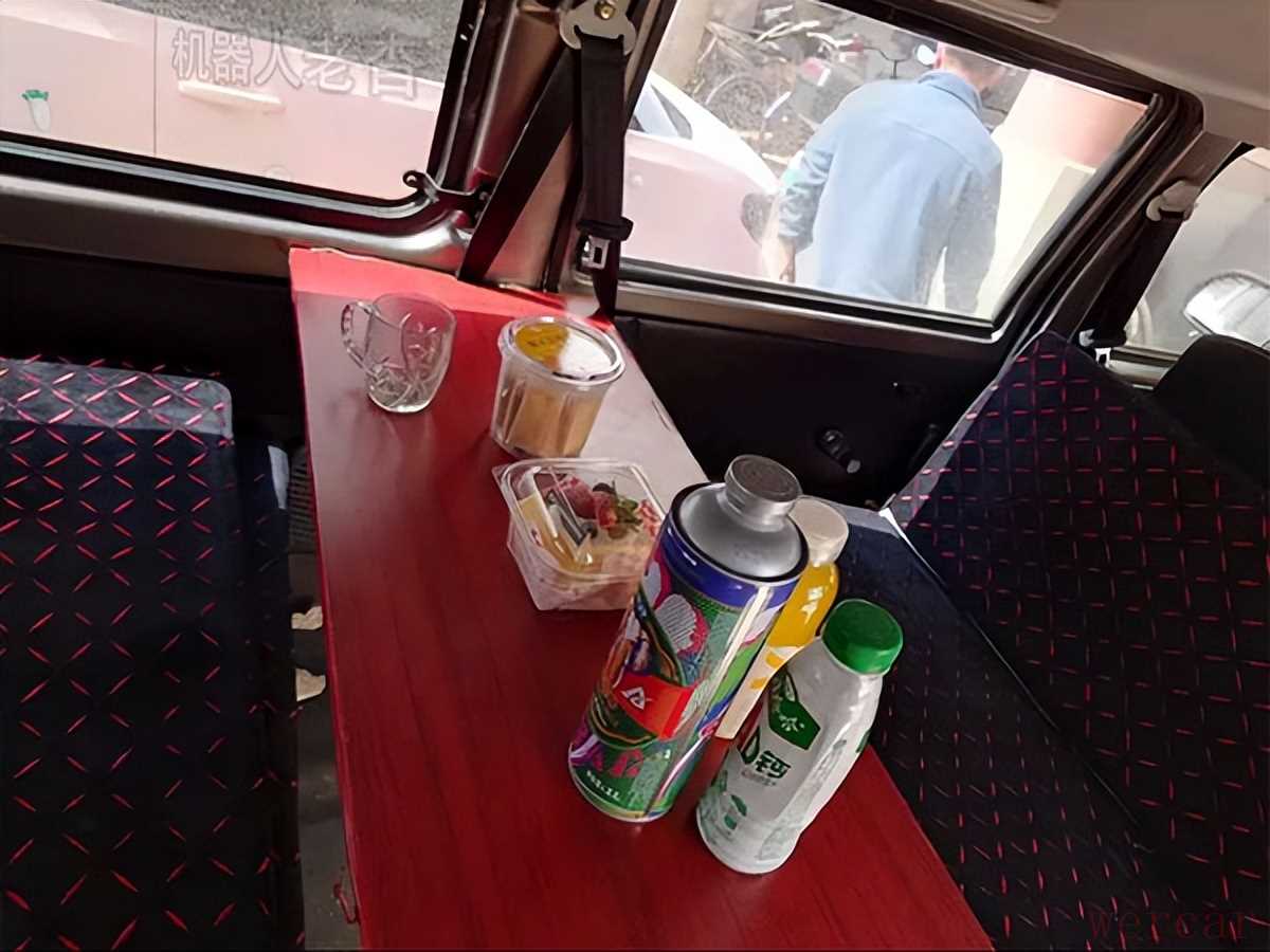 车内中排座椅已向后翻转,座椅之间添置了一张升降桌,组成一处小型会客厅。