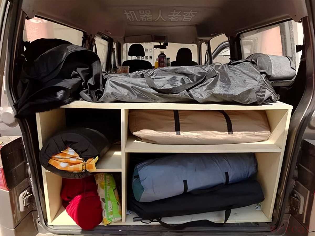 打开上掀式尾门,尾部是四个储物格,车主用来存放被褥等床上用品,其实也可以设计成后置橱柜,户外做饭很方便。一台小面包经过简单改装,秒变旅行露营车,衣食住行齐全,出入灵活,随心情自驾游,经过不同的环境,体会不一样的感受。