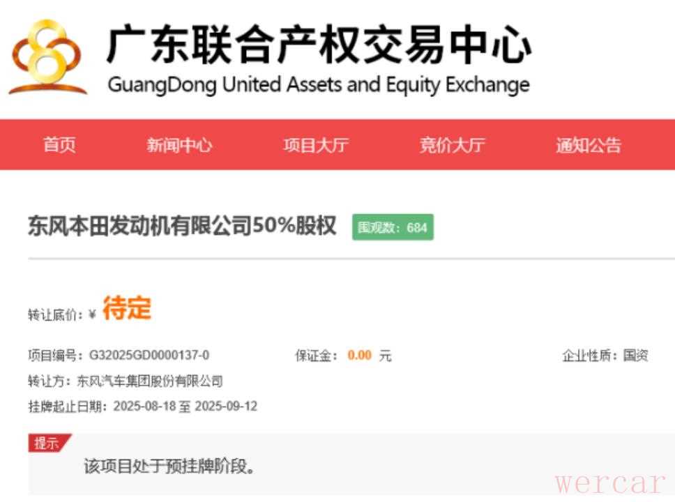 8 月 18 日,广东联合产权交易中心官网显示,东风汽车集团股份有限公司拟出售其持有的东风本田发动机有限公司 50% 股权,目前该项目处于预挂牌阶段,转让底价待定,挂牌截至日期为 9 月 12 日。这一举动被视为东风集团在激烈市场竞争中,加速新能源转型、优化资产结构的重要举措。