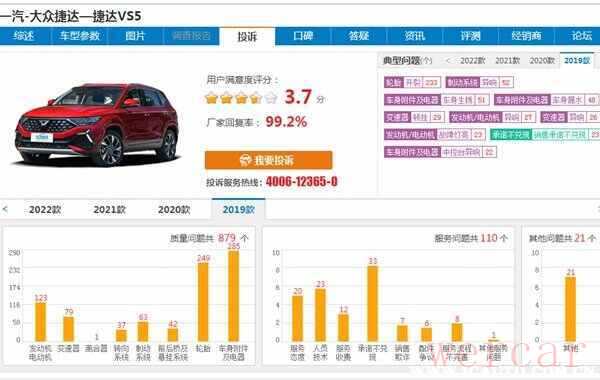 我们先看看捷达VS5的产品质量情况,这部分信息以及数据均参考车质网平台。以2019款捷达VS5为例,3年间共收到879个车主投诉的质量问题,主要故障情况为轮胎开裂233例、制动系统异响52例以及车身生锈51例等等。用户满意度评分5分满分制,捷达VS5分值为3.7分。总体上,捷达VS5质量属于中规中矩,处于行业同级车型主流水平。
