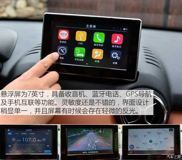 中控台上配备了一块7英寸的悬浮屏,虽然乍一看屏幕较大,不过其四周的黑色边框较宽,看起来让人有些不快。多媒体系统具备收音机、蓝牙电话、GPS导航和手机互联等常用功能,操作起来较为顺畅。下方还设计了钢琴式的控制键,手感还是不错的。