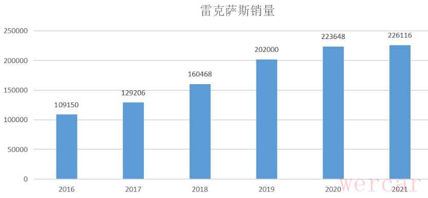 我们来看看雷克萨斯这几年在国内汽车市场的销量数据,从2016年到2021年,六年的时间,雷克萨斯的销量一直呈正向增长,尤其是去年可谓是风光无限,其全年销量达到了226116台,仅次于凯迪拉克的230,007辆的年销量。