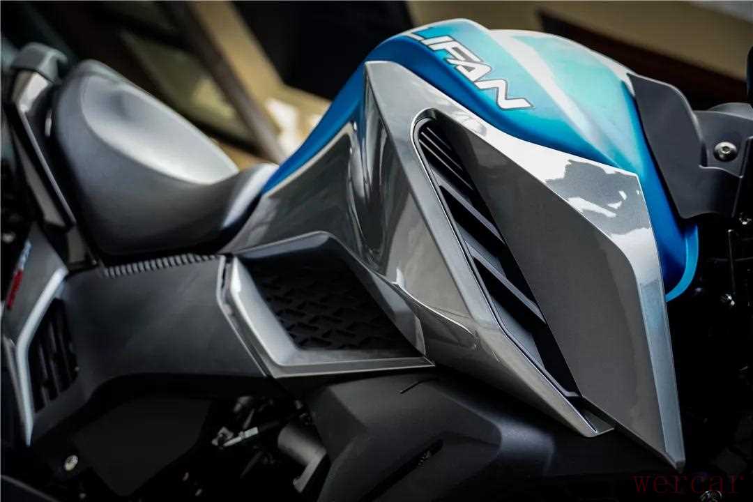 "细节处理:" 飞溅板、挡泥板等部件采用了更亮丽的颜色和质感更好的材质(例如部分车型可能有不同颜色搭配或纹理),提升了整车精致感。油箱盖的设计也更为简洁现代。风镜、灯具等细节也进行了微调,更显精致。