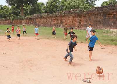 吴哥古迹中的热带雨林、护城河和寺庙周边,是孩子们的天然游乐场。无论雨季还是旱季,总是充满欢声。这是塔布隆寺角砾岩围墙外,生活在吴哥考古公园里的少年在阳光下光着脚踢足球。 (记录于2018年)
