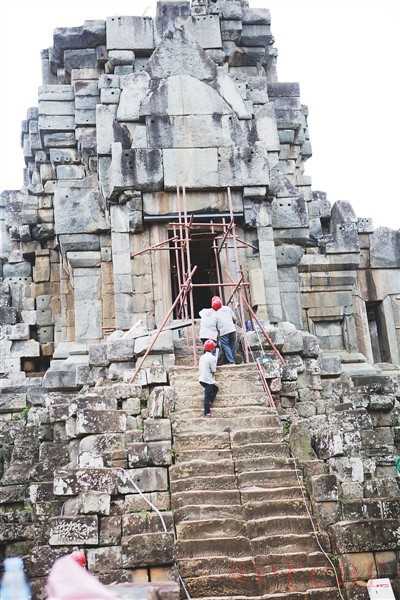 中国工作队对茶胶寺中央主塔抱厦入口进行钢结构支护。由于大型机械设备不能登上须弥台,工人们需要自己搬运钢材。每一个钢结构支护框都是根据石头的残损状况现场制作,通过这种“量体裁衣”的方式确保对石构件不造成任何伤害。 (记录于2016年)