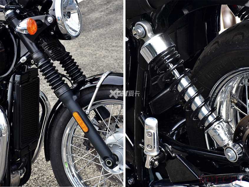 由KYB提供的41mm倒立式前叉保证了Bonneville T100的运动性和舒适性,后双筒油压减震同样由KYB提供,具备预载调节功能;前后减震行程均为120mm,可应对绝大多数路况。