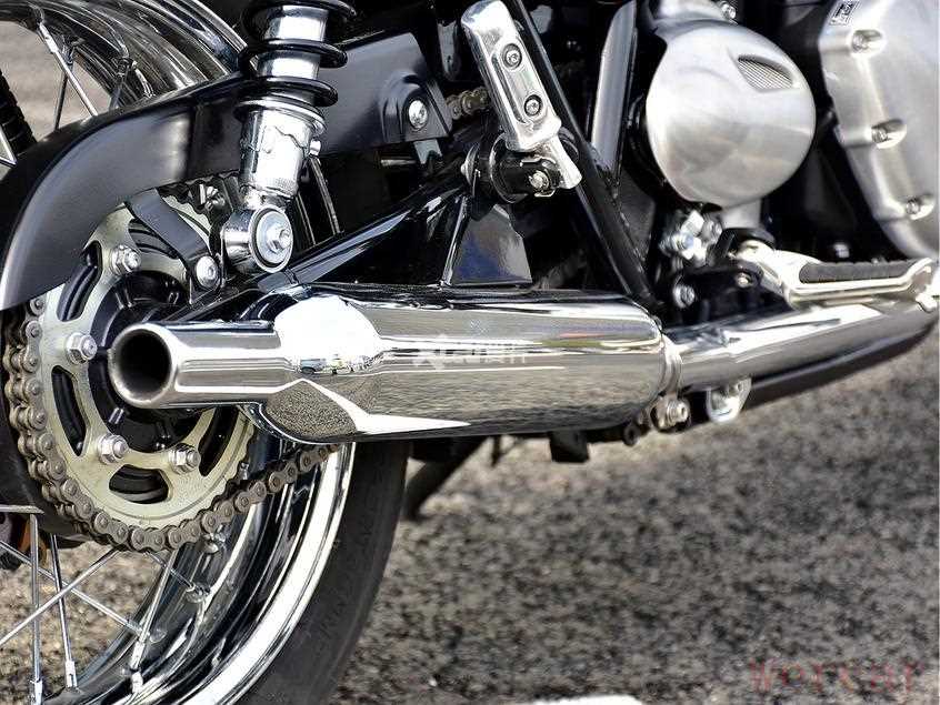 "细节捕捉:" 注意看油箱上精致的凯旋“Triumph”徽标,以及排气管独特的造型,它不仅仅是排气管,更是整体设计的一部分。