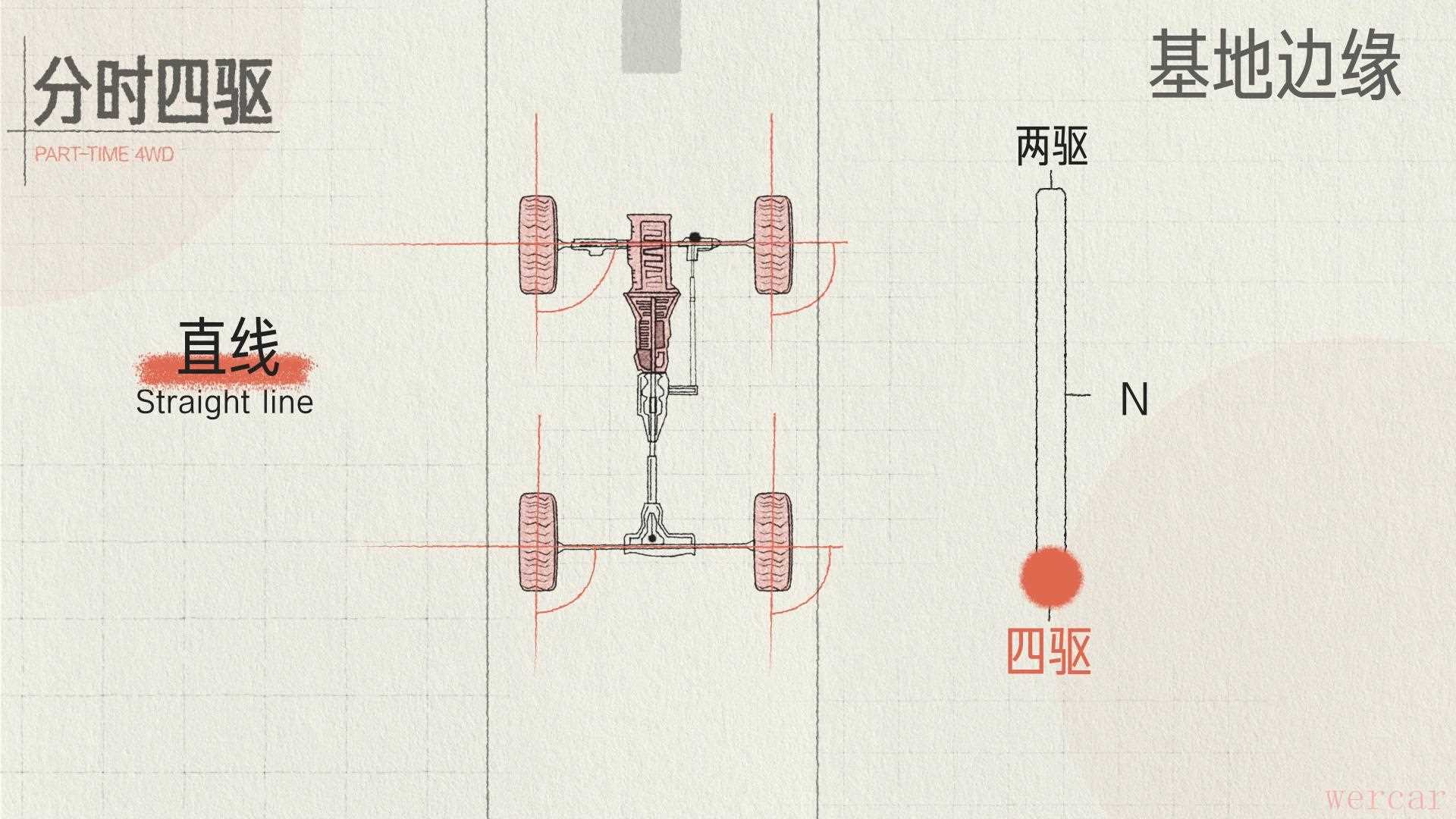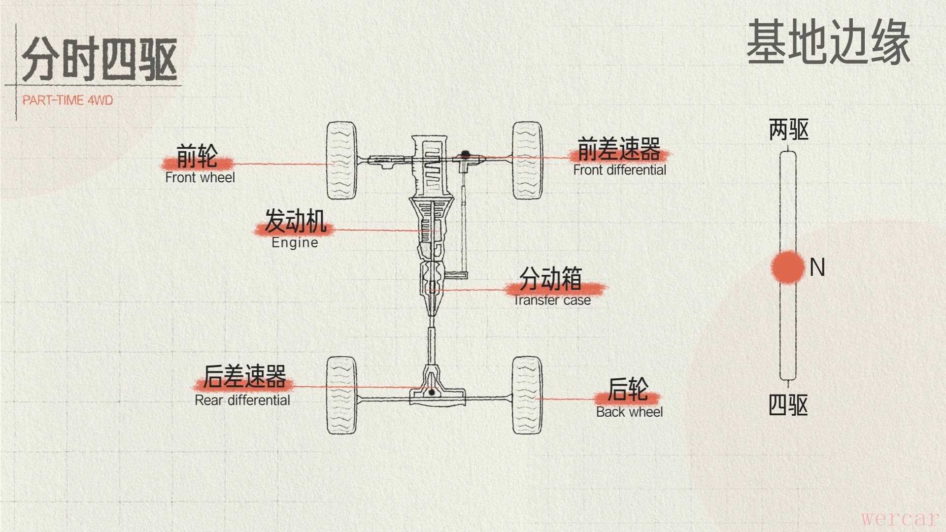 分时四驱,它最明显的特点就是可以由驾驶员来选择,什么时候采用两驱系统、什么时候采用四驱系统。在两驱模式下是标准的前置后驱,而在四驱模式下动力会直接传递到前桥和后桥,动力永远是50:50的分配方式。