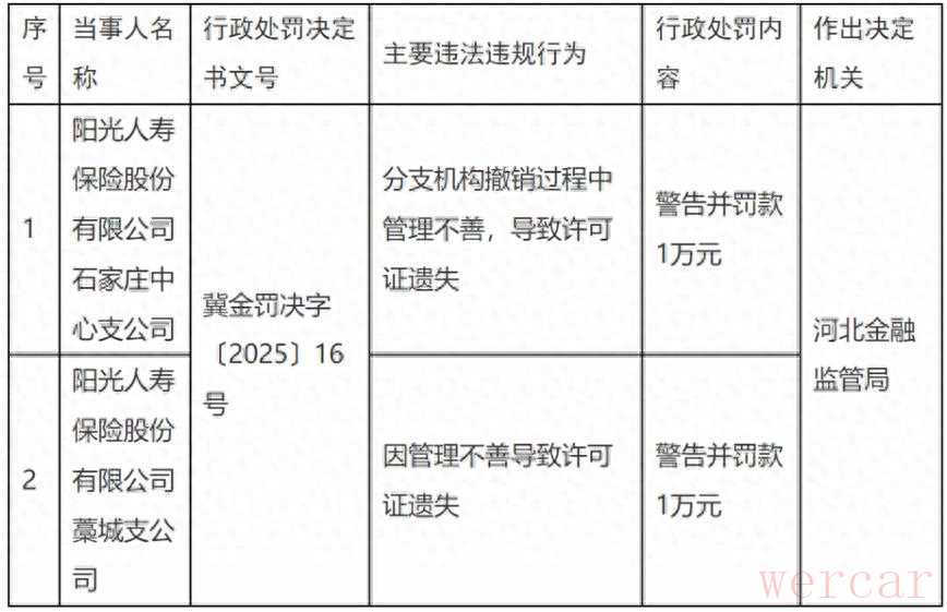 10月17日,国家金融监督管理总局河北监管局发布的行政处罚信息显示,因分支机构撤销过程中管理不善,导致许可证遗失,阳光人寿保险股份有限公司石家庄中心支公司被警告并罚款1万元;因管理不善导致许可证遗失,阳光人寿保险股份有限公司藁城支公司被警告并罚款1万元。