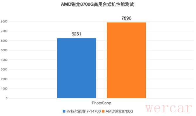 Photoshop是一款广泛使用的图像编辑软件,能够评估处理器在图像处理任务中的性能表现。在Photoshop的综合测试中,锐龙7 8700G的PugetPhotoshop Overall Score为7896,而酷睿i7-14700的得分为6251,性能提升约26%。在Photoshop的各个子项测试中,锐龙7 8700G在滤镜处理速度、图像选择速度、图像调整速度等方面均表现出色,特别是在处理复杂图像时,其高性能集成显卡的优势就变得非常突出。