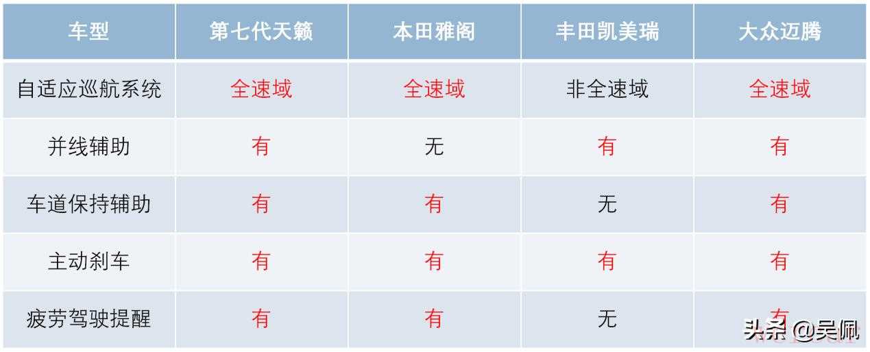 显而易见,第七代天籁和迈腾的智能驾驶辅助系统最为周全。当然,3款日系中级车,也会根据不同车型来调整所搭载的智能驾驶辅助系统,诸如本田引以为傲的Honda Sensing,就在雅阁中出现,丰田的Toyota Safety Sense 智行安全系统也没在凯美瑞上缺席。