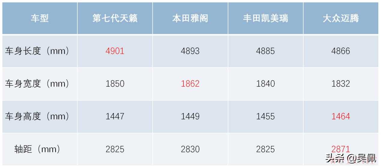 而就后排的实际空间表现而言,轴距相近的3款日系中级车,其腿部空间的余量都是相近的,而德系迈腾在数据表现上则有优势。