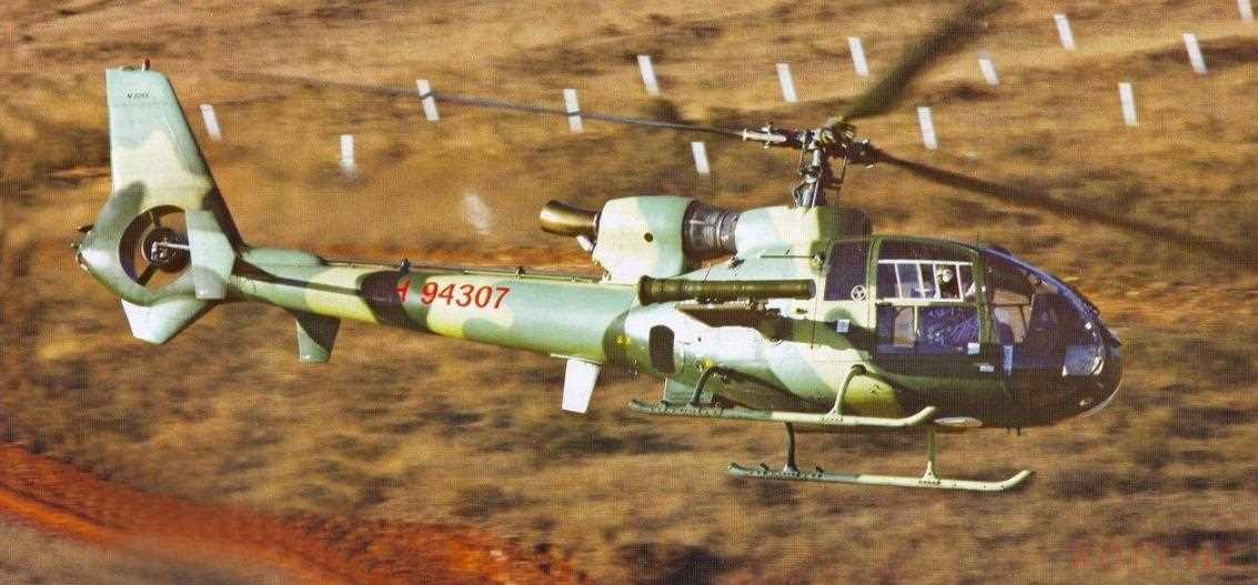 这架直升机就是著名的法国小羚羊武装直升机。小羚羊武装直升机研制于上世60年代,是一种最大起飞重量仅有1.8吨的轻型直升机。小羚羊武装直升机长11.97米,发动机为一台XIVM 涡轮轴发动机,最大飞行速度280千米每小时。和美国曾经大量使用的UH1系列直升机相比,小羚羊的飞行速度却有着明显的优势,然而在其他方面,小羚羊直升机可以说是没有多少优势。