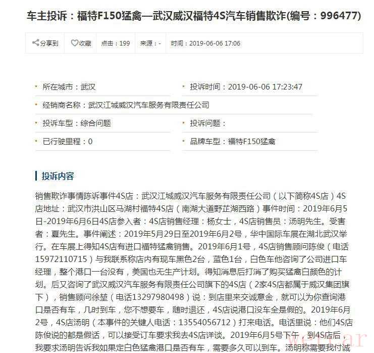 武汉江城威汉4S店被网友反复投诉“销售欺诈”。6月6日至6月11日,有网友分别在自主汽车网、搜狐网、东湖社区等平台投诉:微信转了2万元人民币诚意金给4S店工作人员后,发现定车合同被制作成鸳鸯合同,定车方签名并不是本人,要求退还2万元遭拒。