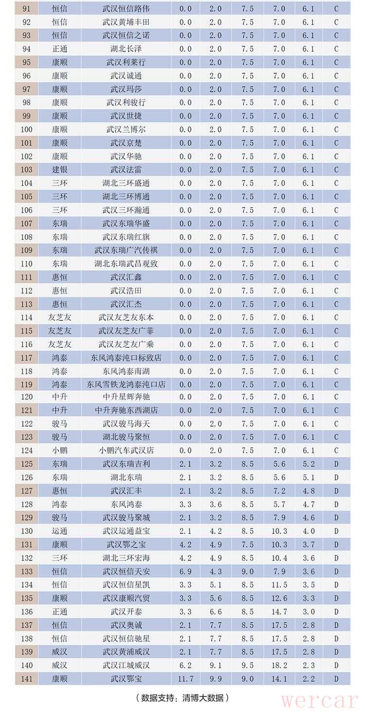 楚天都市报讯(记者李力力)7月30日,楚天都市报联合北京清博大数据科技有限公司,发布6月份武汉汽车4S店网络形象榜单。141家4S店中,4家综合网络形象指数评为A级,28家评为B级,92家评为C级、17家分别评为D级。本次榜单,湖北骏马4S店登上榜首位置,武汉康顺捷路4S店连续三次评级A级。