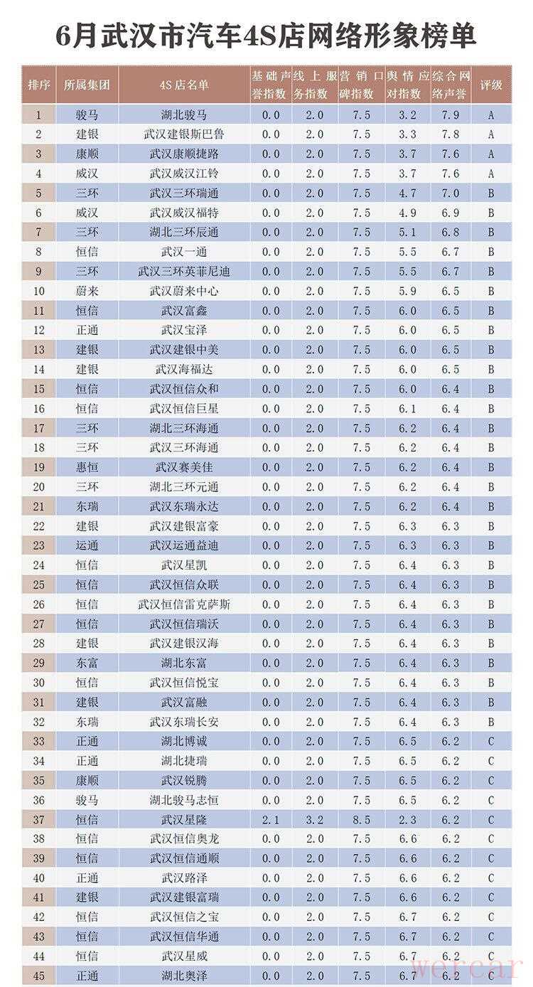 6月武汉汽车4S店网络形象排行榜揭晓,湖北骏马领跑,武汉康顺捷路连续三次荣获A级评价
