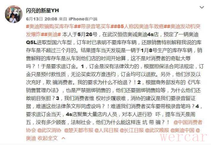 武汉恒信奥诚奥迪4S店则被投诉被销售库存车辆。6月13日,微博名为“闪亮的新星YH”的网友,在新浪微博上投诉:在武汉恒信奥诚奥迪4S店,预定了一辆奥迪Q5L进取型国六车型,订车时已表明不要库存车辆,还跟销售特别解释我说的库存车是不超过三个月的。结果提车当天发现是一辆于1月8号生产的库存车辆,销售解释的库存车是从车到他们店的时间开始算。