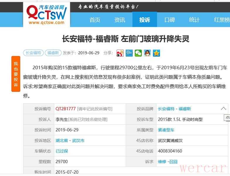 倒数第三的武汉黄浦威汉4S店,被网友投诉汽车质量问题。6月29日,有网友在汽车投诉网投诉“长安福特-福睿斯 左前门玻璃升降失灵”:2015年购买的15款福特福睿斯,行驶里程29700公里左右,于2019年6月23号出现左前车门车窗玻璃升降失灵。