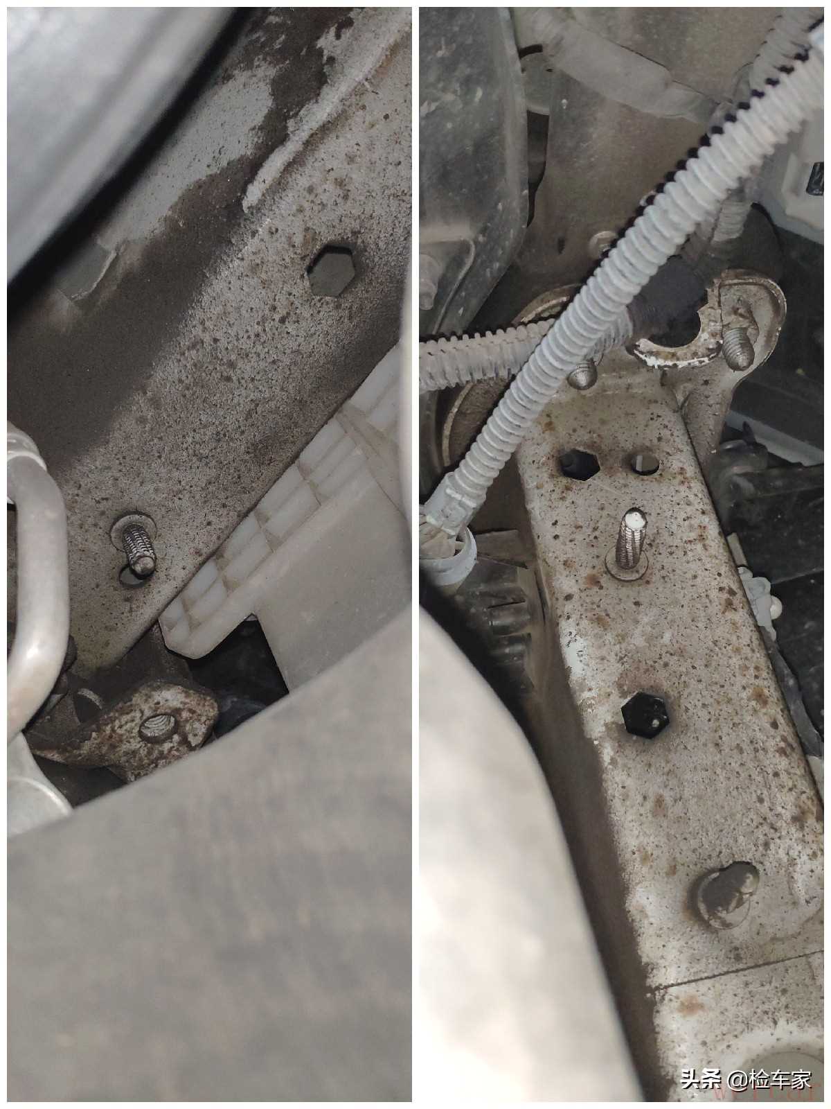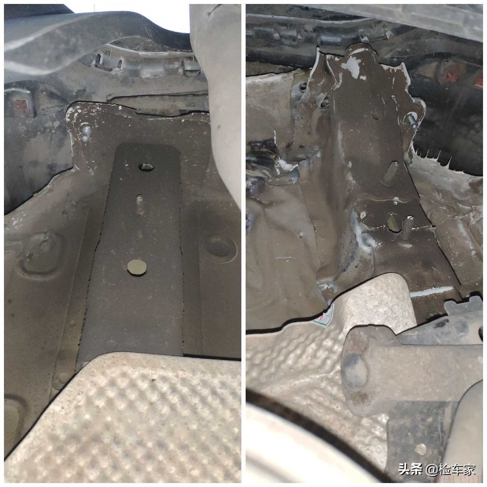 左前右前的纵梁,从底部来看都是没有变形,扭曲修复过的。也就更加能肯定排除前部有过大的碰撞。